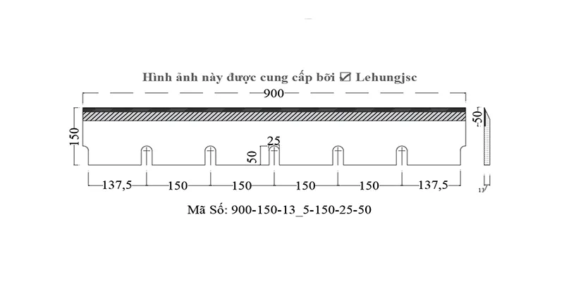 - Khoảng cách tâm rãnh đều: 150 mm, hai biên: 137,5 mm